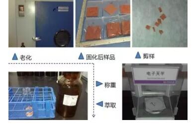 按照推薦性國家標(biāo)準(zhǔn)《合成材料跑道面層》對送檢試樣的要求,樣品應(yīng)在固化14天后進(jìn)行測試.因事情緊急,為更客觀地檢測操場情況,將樣品放入烤箱加速其固化,剪樣、稱重、萃取。