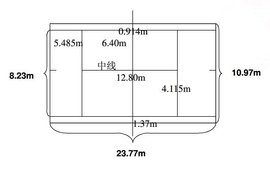 一片標(biāo)準(zhǔn)網(wǎng)球場(chǎng)地的占地面積不小于670平方米(南北長(zhǎng)36.6米(南北長(zhǎng))×東西寬18.3米),這一尺寸也是一片標(biāo)準(zhǔn)網(wǎng)球場(chǎng)地四周圍擋網(wǎng)或室內(nèi)建筑內(nèi)墻面的凈尺寸。在這個(gè)面積內(nèi),有效雙打場(chǎng)地的標(biāo)準(zhǔn)尺寸是:23.77米(長(zhǎng))×10.98米(寬),有效單打場(chǎng)地的標(biāo)準(zhǔn)尺寸是:23.77米(長(zhǎng))×8.23(寬)。