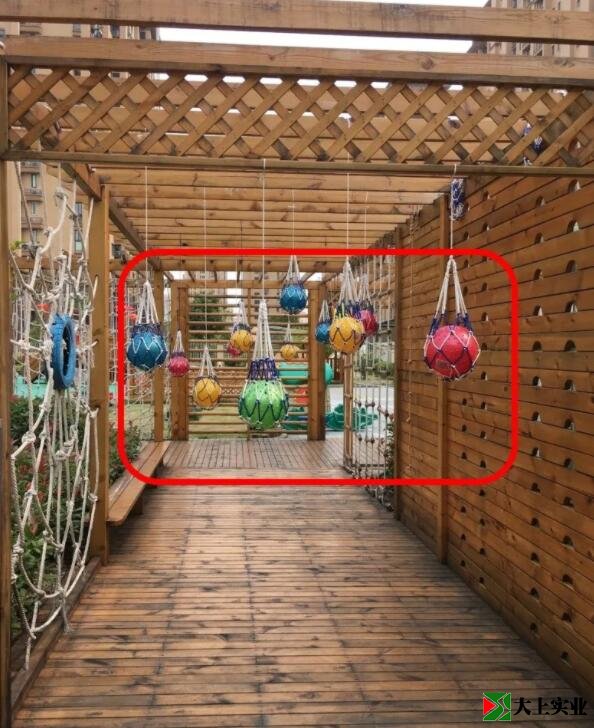 攀爬架:結(jié)合懸垂和跳高,利用幼兒園的富余材料,添置一些材料,在攀爬架處添加懸垂鐵環(huán)、皮球、鳥窩等,豐富幼兒在本區(qū)域中的運(yùn)動(dòng)形式。