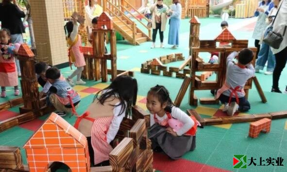 戶外建構(gòu)區(qū):大廳門前的空地和大門進(jìn)入教學(xué)樓的空地只有在來園離園時(shí)用,平時(shí)幾乎是空置的。我們嘗試在這里開辟建構(gòu)區(qū),設(shè)置材料架,放上碳化木塊。精彩的建構(gòu)游戲在此發(fā)生了,拓展了游戲可能。