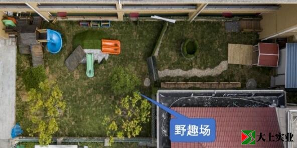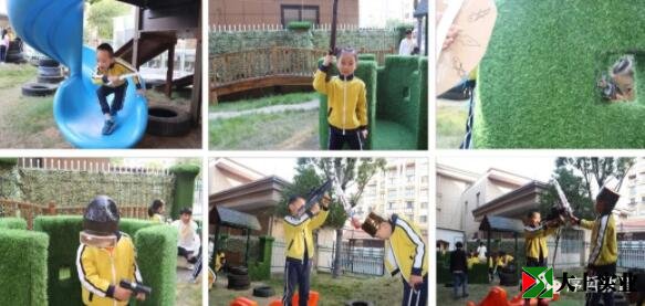 野趣場(chǎng):教學(xué)樓后院原先是長(zhǎng)不出菜的菜園,因?yàn)楸酬帥]有陽光。于是,我們?cè)诖私ㄐ〕潜?,添軍?duì)服飾道具,以引發(fā)孩子野戰(zhàn)游戲。